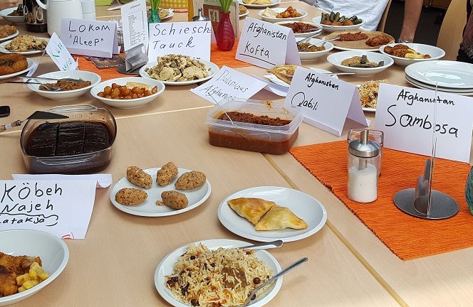 Vielfaltküche der Kulturgießerei, leckere arabische Speisen auf einem großen Tisch